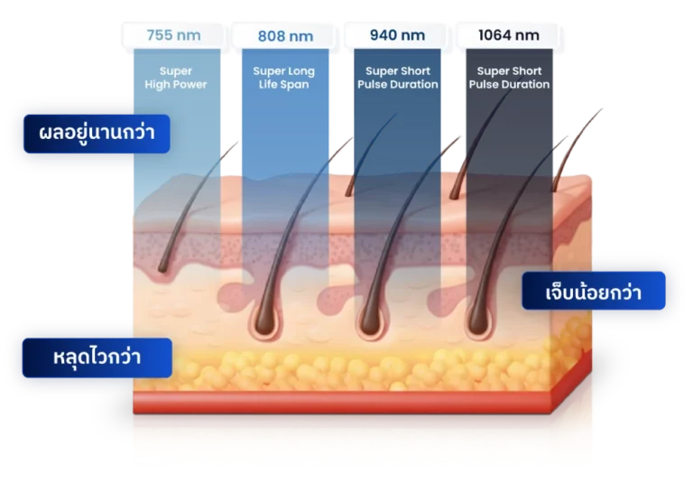Diode laser จึงครอบคลุมการกำจัดขนในหลายระดับความลึกได้ดีและตอบโจทย์ในทุกสีผิว ทุกสภาพเส้นขนที่แตกต่างกันออกไป เหมาะกับคนไทย